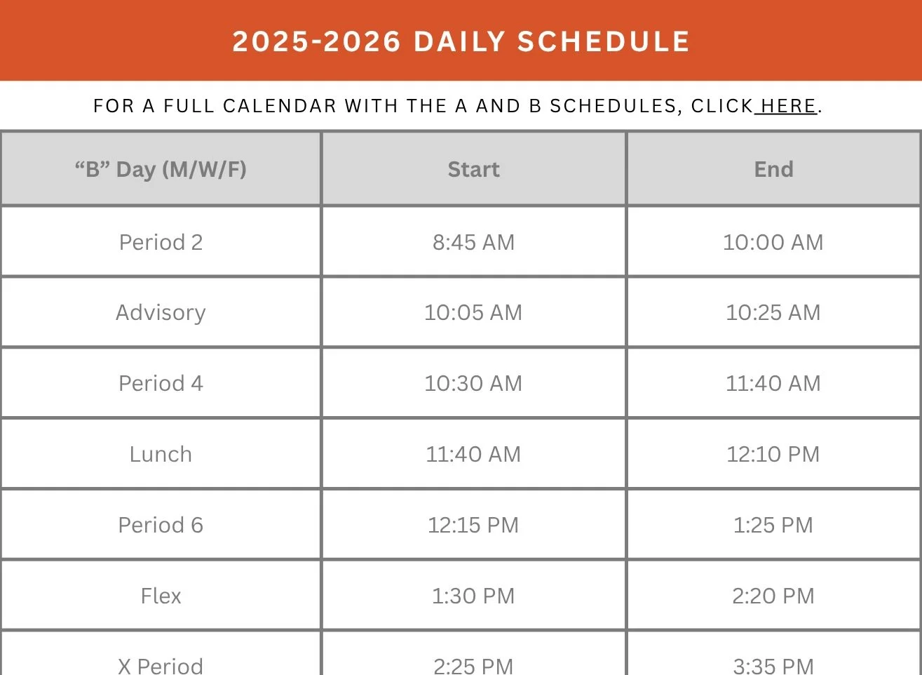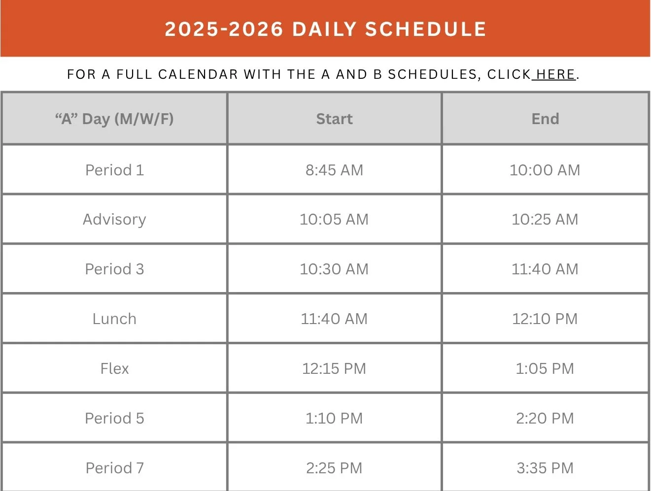 Daily Schedule For the full calendar with the A & B schedules, click here. Fabiola PriceAugust 5, 2025 Facebook0 Twitter LinkedIn0 Reddit Tumblr Pinterest0 0 Likes